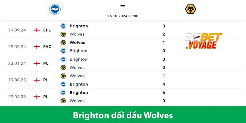 Trận cầu giữa Brighton và Wolves, hứa hẹn sẽ là cuộc đối đầu đầy hấp dẫn. Brighton được đánh giá cao hơn với phong độ ấn tượng. Tuy nhiên, ở trên chỉ là nhận định dựa trên những phân tích và thống kê của nhà cái De bet, kết quả của trận đấu này vẫn có biến động.
