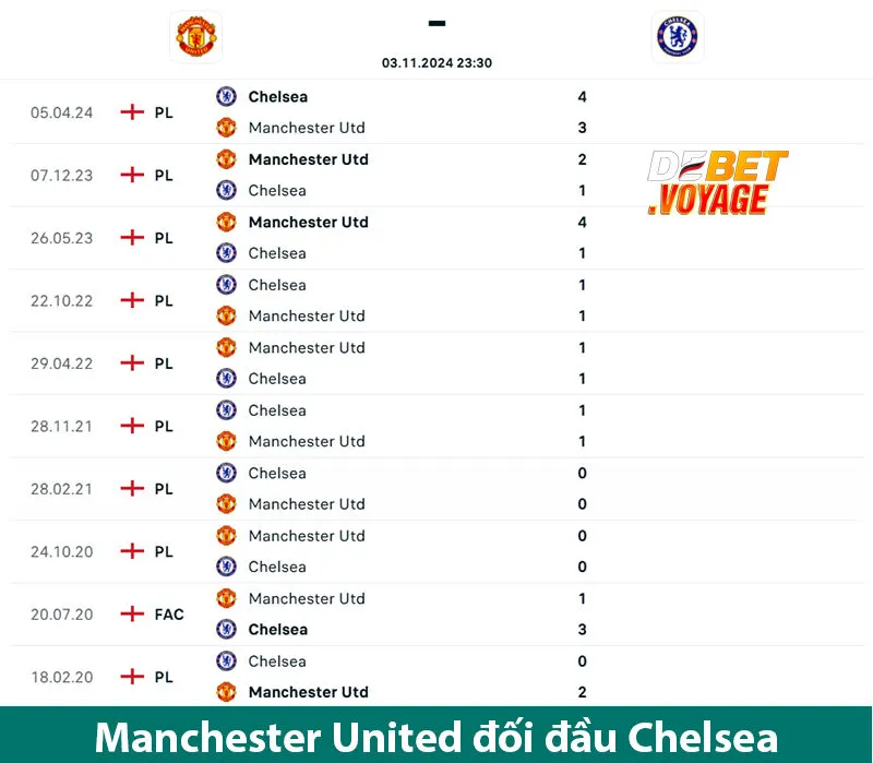 6 trận gặp nhau gần đây trên mọi đấu trường của hai đội, MU thắng 2 hòa 3 và thua 1 trận. Cuộc chạm trán gần nhất tại Ngoại hạng Anh ngày 31/04/2024, kết thúc với chiến thắng 4-3 cho Chelsea.